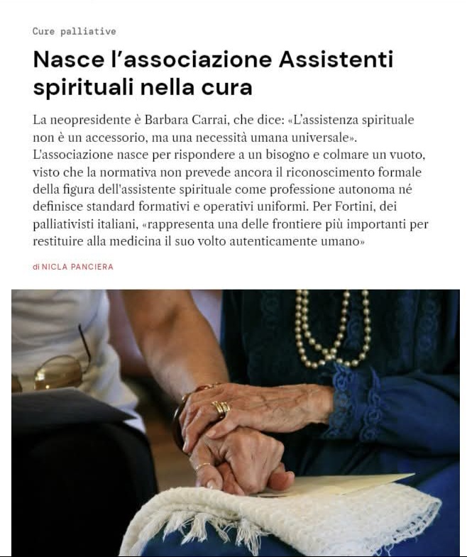 Dal 2024 sono diplomata come Assistente Spirituale Laico nelle Cure Palliative presso la Scuola di Alta Formazione a Prato. Si tratta di una figura professionale orientata a diventare membro dell’èquipe medica.